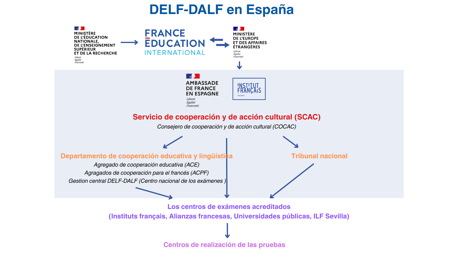 El Centro nacional de exámenes-CNE es el servicio que, bajo la autoridad del Consejero del Servicio de Cooperación y Acción Cultural de la Embajada de Francia, asegura la gestión del dispositivo DELF-DALF a nivel nacional en España.